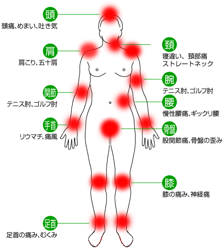 ぜひ、腰痛、肩こり、頭痛、四十肩、五十肩、ぎっくり腰、手・足のしびれ、膝の痛み、めまい、生理痛や産前産後の不調、慢性疲労など、その他のあらゆる痛みでお困りの方は当院にて本物のカイロをご体験ください。 |